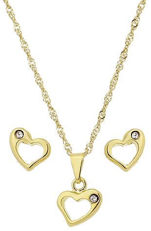 Conjunto contendo pingente, brincos e corrente folheados a ouro. Brincos e pingente em forma de um coração vazado com pedrinha de strass.
